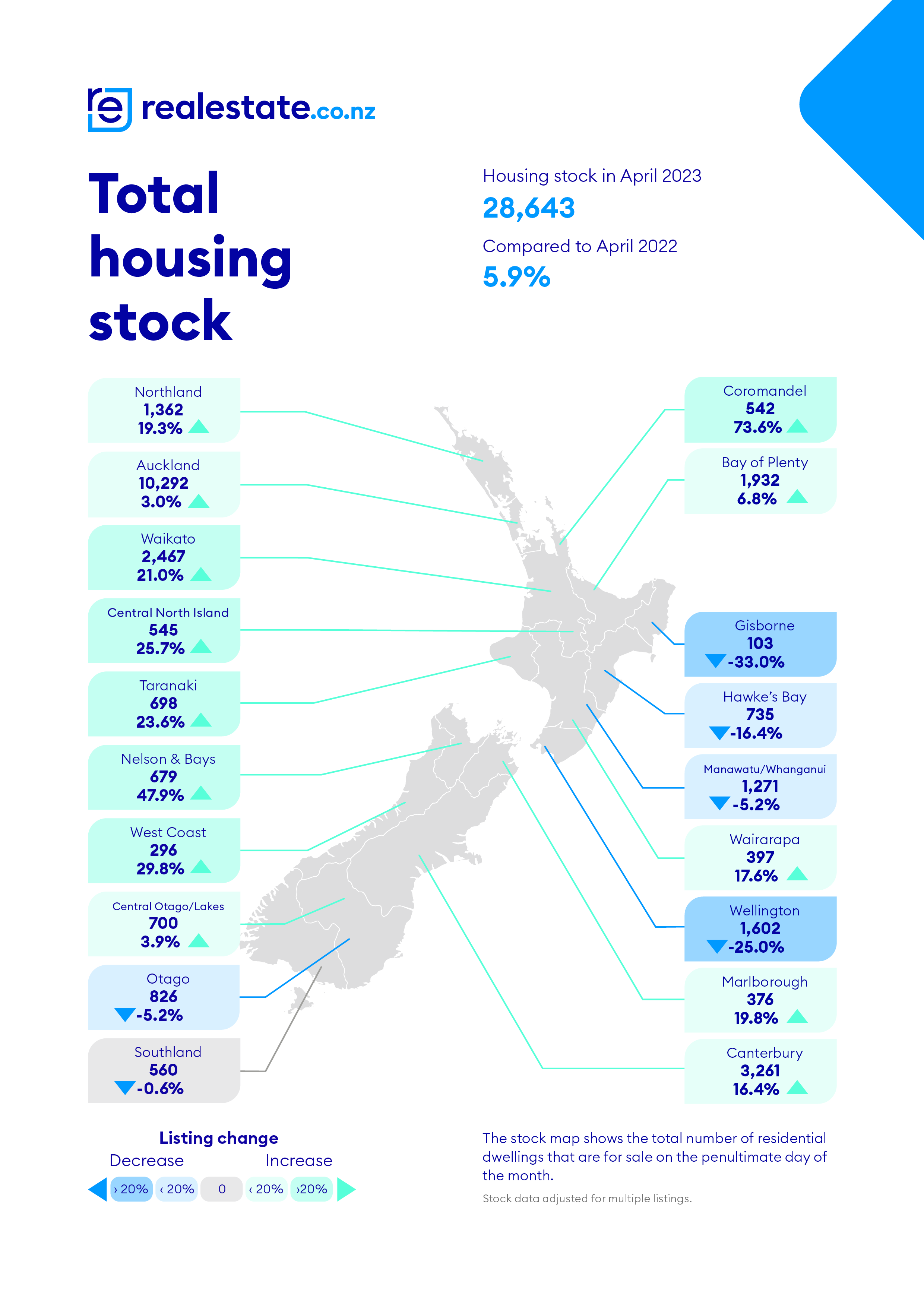 Around the country the biggest increase in the amount of stock for sale at the end of April compared to a year earlier occurred in Coromandel, up 73.6%, while Gisborne posted the biggest decline at -33%.
